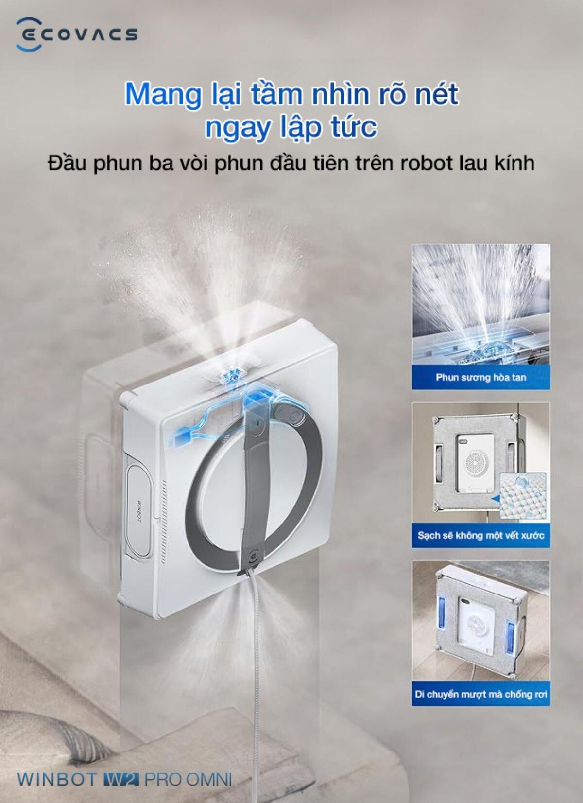 Robot lau kính Ecovacs Winbot W2 Pro Omni là robot lau kính đầu tiên của Ecovacs có trạm sạc di động, cho phép hoạt động không giới hạn, dễ dàng vệ sinh mọi loại cửa sổ. Với lực hút mạnh mẽ lên đến 5500Pa và các công nghệ hiện đại, mang lại hiệu quả làm sạch tối ưu và an toàn tuyệt đối. Công nghệ phun sương góc rộng ba vòi phun độc quyền, hòa tan và loại bỏ mọi vết bẩn chỉ trong một lần lau. Winbot W2 Pro Omni trang bị hệ thống lập kế hoạch đường đi thông minh WIN-SLAM 4.0, đảm bảo cửa sổ được làm sạch toàn diện, không bỏ sót bất kỳ vị trí nào.