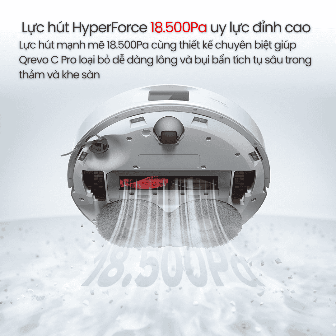 Lực hút siêu mạnh: Q Revo C Pro sở hữu lực hút HyperForce™ lên tới 18.500 Pa, giúp hút sạch bụi mịn, tóc rối và rác ở khe hở sàn.