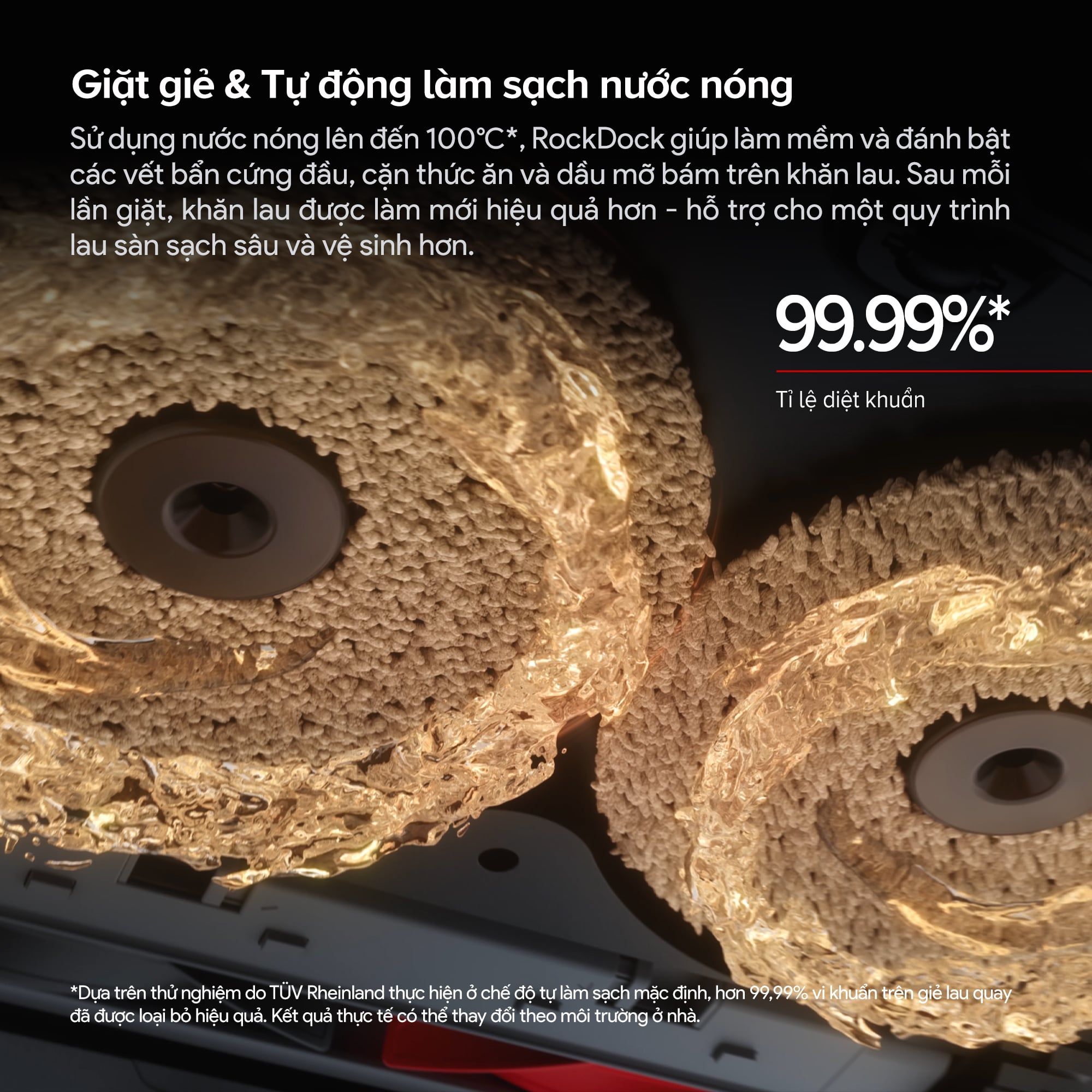 Hệ thống chống rối kép, giẻ lau xoay tăng lực ép, điều hướng StarSight 2.0 nhận diện hơn 200 vật cản và cảm biến sát biên giúp làm sạch chính xác đến từng góc cạnh. Dock sạc đa năng giặt giẻ nước nóng 100°C, tự sấy khô, diệt khuẩn 99.99%, kết hợp điều khiển qua app và giọng nói, mang lại trải nghiệm dọn dẹp hoàn toàn tự động và thông minh.